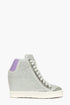 Sneakers Uppside Lux in camoscio ghiaccio e riporto in crac argento e pelle lilla sul retro, laccio bianco, interni in spugna bianca, rialzo interno, sulla scarpa applicati a caldo strass, suola in gomma bianca, altezza 9.